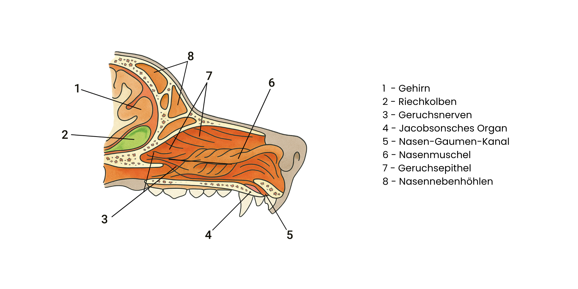 Hunde haben einen isolierten „Gang“ in ihrer Nase, der nur für das Aufnehmen von Gerüchen zuständig ist (der olfaktorischen Aufnahme). Dieser ist von den respiratorischen Gängen getrennt, durch die der Hund atmet. Ca 10 – 15% der Atemluft werden direkt in diesen olfaktorischen Gang aufgenommen.